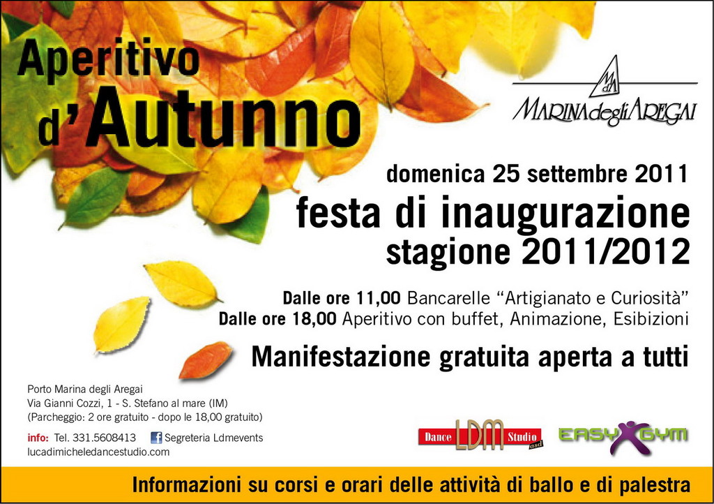 Domenica 25 settembre 2011 alla Marina degli Aregai di Santo Stefano al Mare (via Gianni Cozzi 1), si terrà ‘Aperitivo d'Autunno’ la festa di inaugurazione della stagione 2011/2012. Dalle ore 11 apriranno le Bancarelle con ‘Artigianato e curiosità’ e dalle ore 18, sono in programma: Aperitivo con Buffet, Animazione ed Esibizioni. Durante la manifestazione (gratuita aperta a tutti), all'interno della galleria commerciale, si potranno avere informazioni sui nuovi corsi di Latino-Americano, Tango Argentino, Danza Moderna e Fitness per bambini e adulti.