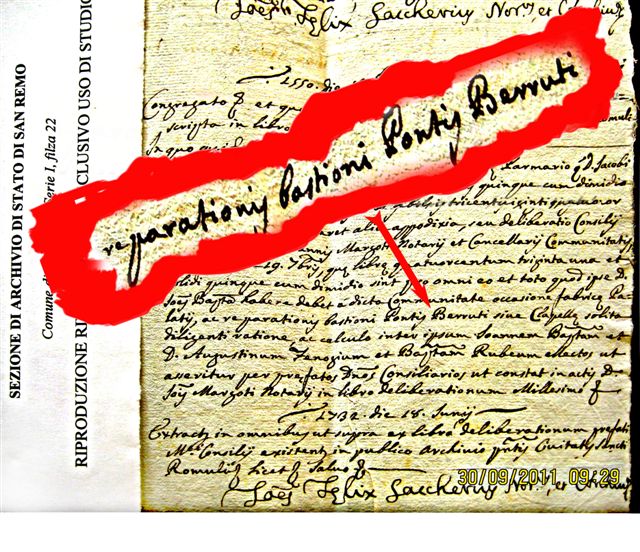 “Nilo Calvini nel suo libro ‘Le fortificazioni’ scritto in collaborazione con l’amico Sarchi fa cenno a pag. 110 ad alcune delibere prese nel 1550 dal Consiglio cittadino dell’epoca barbaresca, quando i maggiorenti del Comune erigono nuove difese riparandone altre usurate dal tempo. Dalle delibere all’Archivio di Stato di Sanremo sono emersi dati alquanto importanti. Nelle delibere datate agosto/ottobre 1550 si fa riferimento a lavori di completamento del Palazzo Comunale di Piazza nota, iniziati nel 1533 ed a lavori di reparazionij bastioni Pontis Berruti sive Chappella