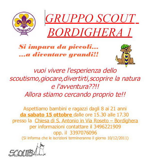 Per la riapertura di ‘Anno Scout’, Diego Lentini, detto ‘Chil’, del gruppo Scout Bordighera 1, comunica che i bambini e ragazzi dagli 8 ai 21 anni interessati a vivere l'esperienza dello scoutismo, giocare, divertirti, scoprire la natura