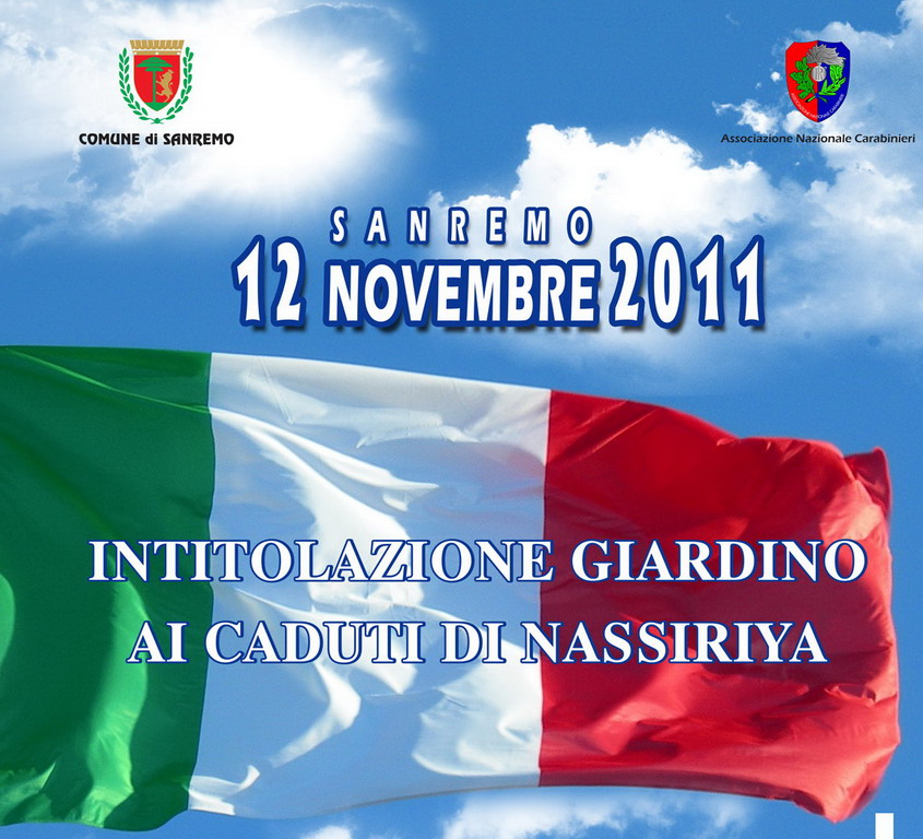 L’Amministrazione Comunale, in collaborazione con l’Associazione Nazionale Carabinieri, sabato prossimo, nel giorno dell’8° anniversario dell’attentato, organizza una solenne cerimonia di intitolazione di un giardino della Città ai Caduti di Nassiriya, alla presenza delle massime autorità civili, militari e religiose e di alcuni familiari delle vittime.
