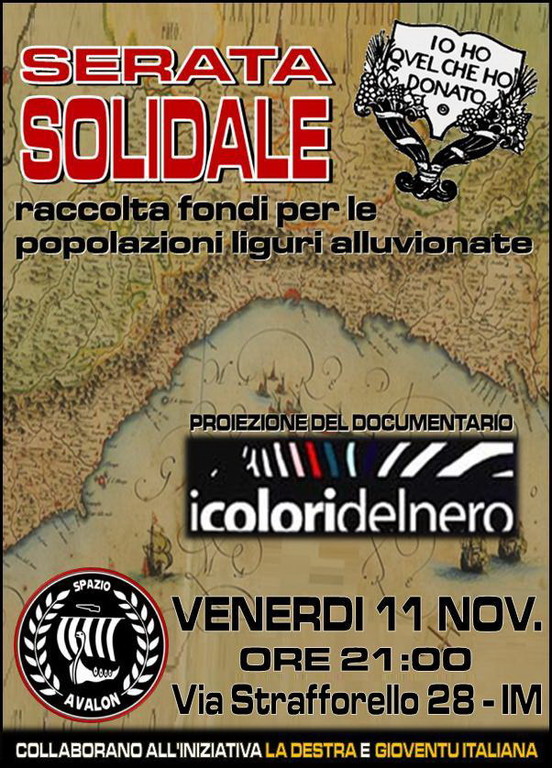 Durante la serata sarà proiettato il documentario del giornalista Ugo Tassinari dal titolo 'I colori del nero', che offre una panoramica sul variegato mondo della destra italiana attraverso l’intervista a 7 protagonisti di quest’area politica degli anni 70-80, ma tutt’ora presenti ed attivi. Infine verranno raccolti i contributi economici in favore delle comunità alluvionate. Tutto il ricavato verrà destinato alla Croce Rossa Italiana che, in questi giorni, è impegnata in prima linea per contrastare l’emergenza nelle aree maggiormente colpite dall’alluvione.