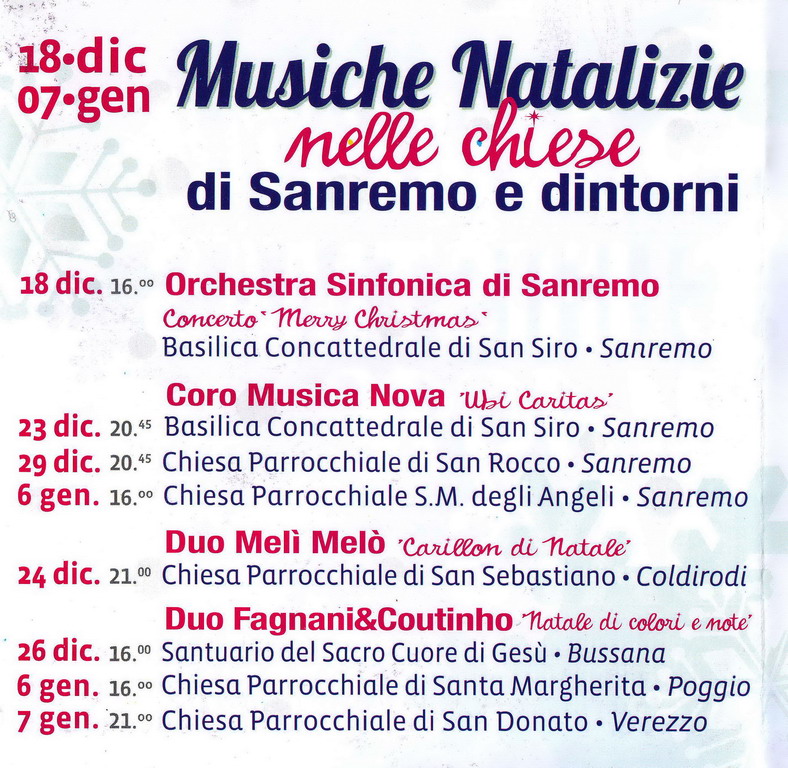 Prevista anche la riproposizione dei concerti nelle Chiese delle frazioni con 'Musiche Natalizie da tutto il mondo', a cura della Cmc. Previsti concerti il 24 dicembre (Coldirodi), 26 a Bussana, 6 gennaio a Poggio e 7 gennaio a Verezzo.