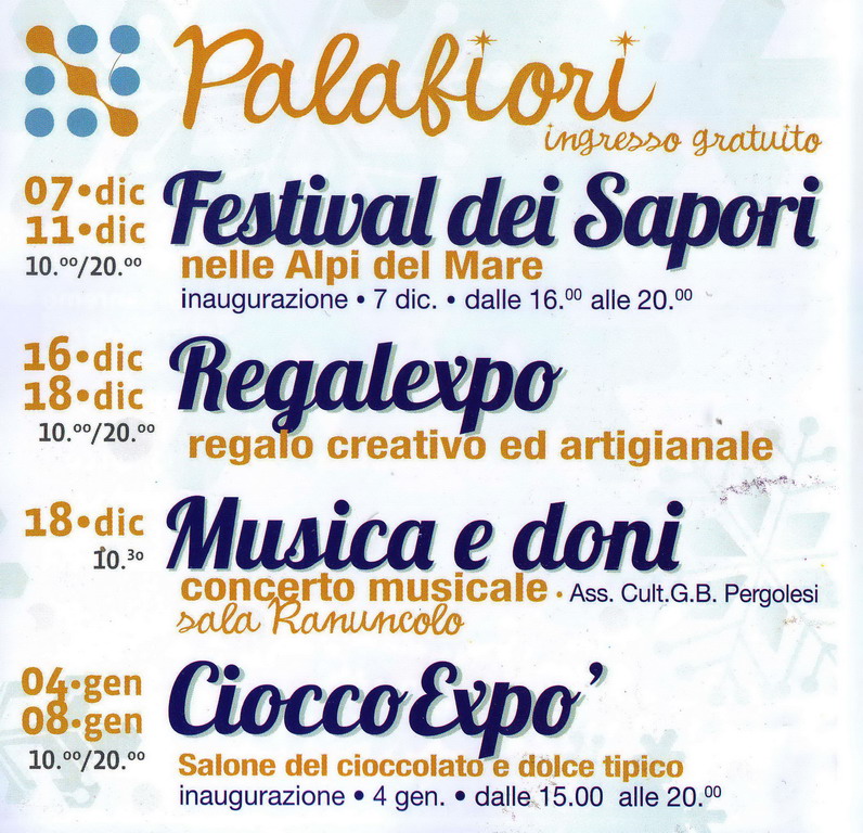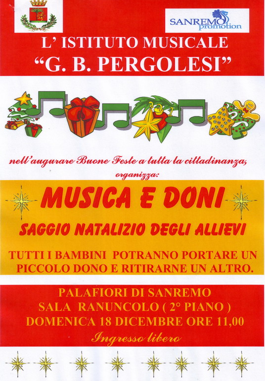 L'Istituto Pergolesi proporrà 'Musica e Doni', un Concerto natalizio (il 18 dicembre al Palafiori, ore 11) con un scambio di doni per bambini e la beneficienza a favore dell'Istituto 'Padre Semeria' di Coldirodi. Previsti anche alcuni concerti del Coro 'Musica Nova'.