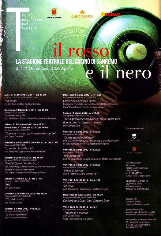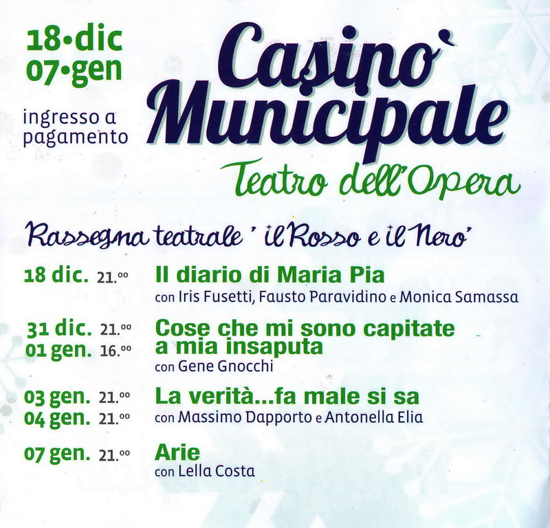 Al Casinò è prevista una interessante rassegna teatrale, con molti volti importanti del panorama italiano, tra cui Gene Gnocchi, Massimo Dapporto ed Antonella Elia, Lella Costa ed altri.