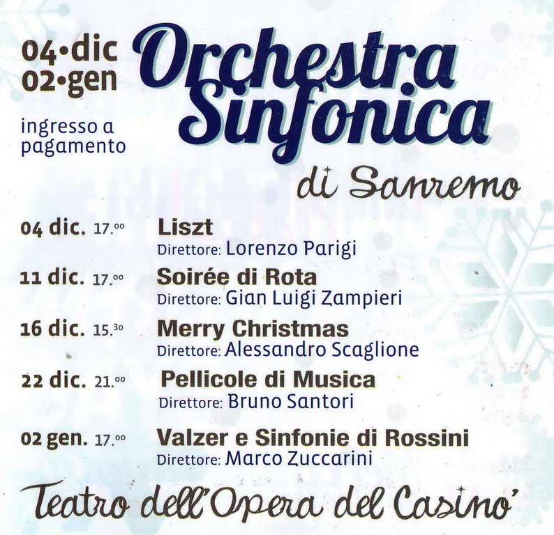 L'Orchestra Sinfonica proporrà in questo periodo dell’anno, alcuni concerti al Teatro dell'Opera del Casinò. Il primo si è già svolto ieri mentre gli altri sono fissati in diverse date del mese con l'ultimo il 2 gennaio, Diretto da Marco Zuccarini.