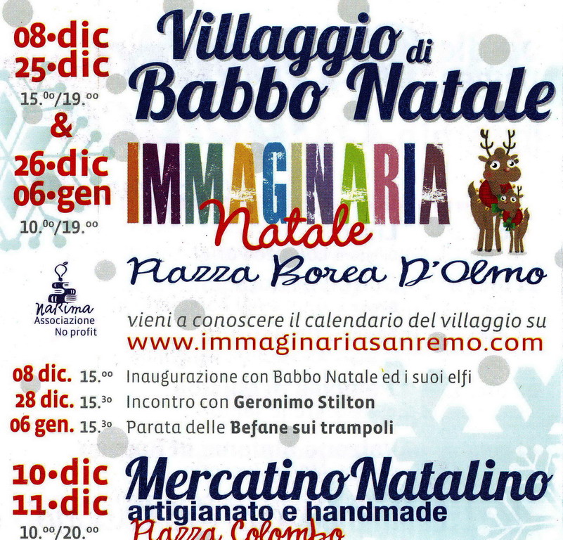Carlotta e Simona De Melas hanno presentato la versione natalizia di Immaginaria: "Il villaggio di Babbo Natale vuole creare la ‘magia’ della festa per i bambini, creando socializzazione ed intrattenimento puro. Il tutto donando piccoli sogni ai piccoli che parteciperanno. Cercheremo di creare un ‘nuovo tipo di turismo’ che possa accogliere bimbi di Sanremo ed anche di altre città. Abbiamo coinvolto per questo altri enti ed associazioni, che regaleranno laboratori a tema per i bambini, tutti di vario genere. Ci sarà il vero ‘incontro’ con Babbo Natale che riceverà le classiche ‘letterine’ dei bambini. L’inaugurazione è fissata per l’8 dicembre con Babbo Natale che, partendo da Villa Zirio, raggiungerà piazza Borea D’Olmo. Fino al 26 ci proporremo solo nel pomeriggio mentre, dal 27 al 6 gennaio ci saremo anche al mattino. Previsti giochi e 'cacce al tesoro' con, in premio, tantissimi biglietti per il ‘Luna Park’. Sempre in piazza Borea D’Olmo proporremo il ‘Capodanno dei Bambini’, dal 'trucca bimbi' del mattino alla ‘baby dance’ del pomeriggio. Il 6 gennaio si ripeterà la ‘magia’, questa volta con la Befana. Le associazioni coinvolte sono tutte liguri e la maggior parte saranno locali, per dare una connotazione ligure alla manifestazione”.