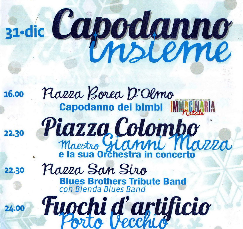 Il Capodanno di piazza Colombo vedrà l'orchestra del Maestro Gianni Mazza festeggiare i 35 anni di carriera. Dalle 22.30, con l'organizzazione della 'Eccoci eventi', sono previsti giochi e musica. Quindi la prima parte del concerto fino a mezzanotte, con l’intervento dell’Amministrazione ed i fuochi d’artificio. Successivamente torna la musica, fino alle 2. In piazza San Siro la 'Blenda Blues Band' ispirata ai ‘Blues Brothers’ ed il supporto di Dj.
