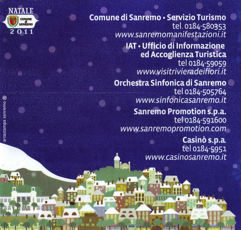 Con 64mila euro più 5.000 per la rassegna teatrale del Casinò, il Comune di Sanremo riesce a proporre comunque, in un periodo di crisi per tutti, un calendario manifestazione per Natale e Capodanno, comunque più che dignitoso, per garantire gioia e serenità a grandi e piccini e con punte di grande qualità, sia nelle piazze che al Casinò. Palazzo Bellevue, attraverso il coordinamento del vice Sindaco Claudia Lolli e del Dirigente del settore turismo, Rita Andena, vuole garantire un mese allegro e divertente in tutta la città, con musica ed appuntamenti, senza dimenticare i grossi nomi e la cultura.