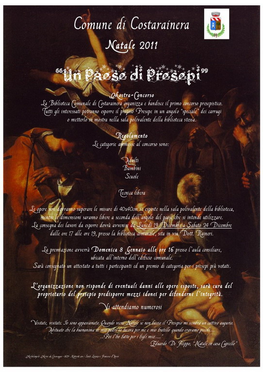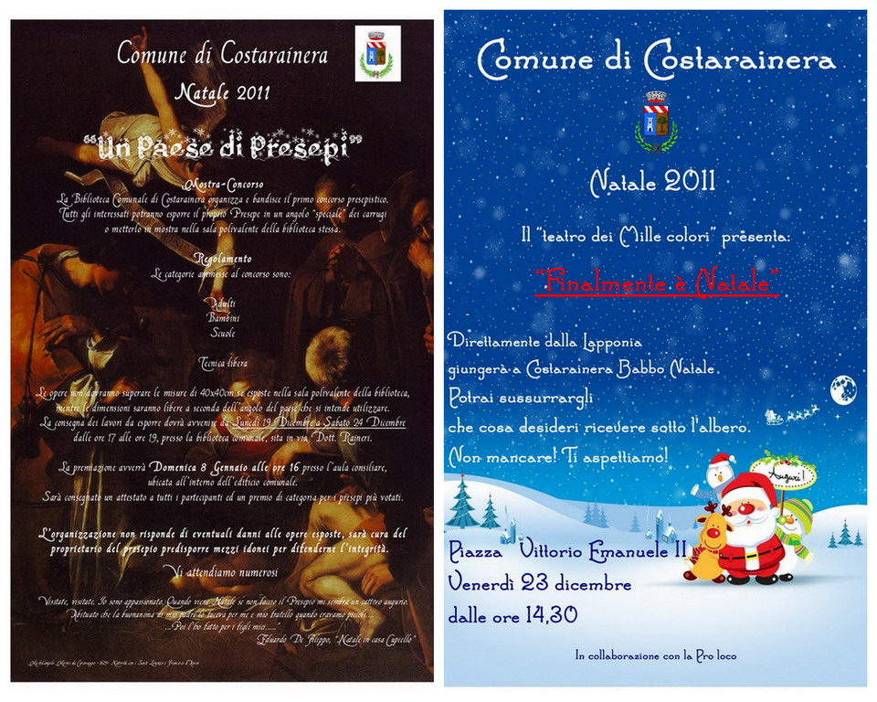 Lo stesso Comune di Costarainera organizza la mostra concorso 'Un paese di Presepi'. La premiazione si svolgerà l'8 gennaio alle 16 preso l'aula consiliare, all'interno del Comune. Verrà assegnato un attestato ai partecipanti ed un premio di categoria per i presepi più votati.