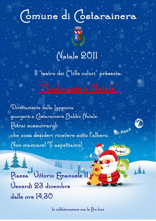 Venerdì prossimo alle 14.30, in piazza Vittorio Emanuele II a Costarainera il 'Teatro dei Mille Colori' presenta 'Finalmente è Natale'. Arriverà il classico 'Babbo Natale' ed i bimbi potranno sussurrargli i desideri da ricevere sotto l'albero.
