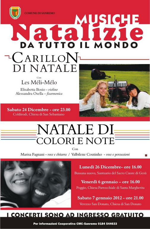 Il duo torinese Les Méli Mélo tornerà a Coldirodi la sera di Natale (ore 23.00) per aprire con un intenso concerto chiamato “Carillon di Natale” la Santa Messa officiata da Don Pasquale Traetta nella Chiesa di San Sebastiano, tradizionalmente affollatissima. Si eseguirà un repertorio di brani natalizi di diversa estrazione (per provenienza geografica e data di composizione) con una cascata di note proposte da fisarmonica e violino. Il duo italio-brasiliano composto dalle cantanti e strumentiste Valbilene Coutinho e Marisa Fagnani è invece protagonista di un trittico di eventi, programmati, sempre in chiesa, lunedì 26 dicembre (Bussana Nuova, ore 16.00), venerdì 6 gennaio (Poggio, ore 16.00) e sabato 7 gennaio (Verezzo San Donato,ore 21.00).