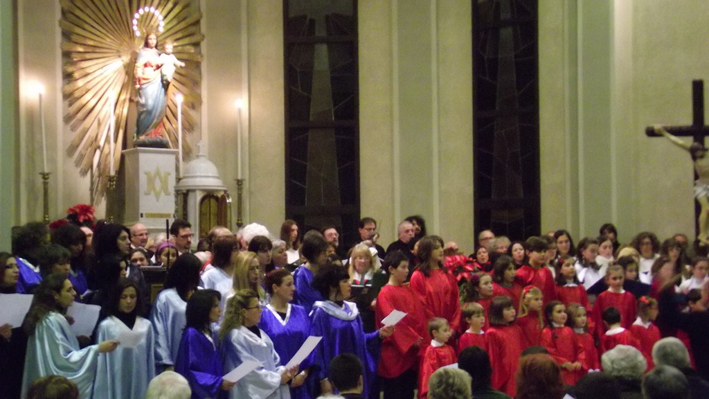 Grande l'affluenza di pubblico, almeno 600 persone. Formula consolidata di due brani, di repertorio natalizio, cantati da ogni coro. Al termine tutti i corsiti hanno anche cantato insieme tre pezzi: è stato uno spettacolo davvero raro, per le nostre zone, vedere ed ascoltare oltre 150 cantori sull'altare diretti dal Prof. Mario Molinari.