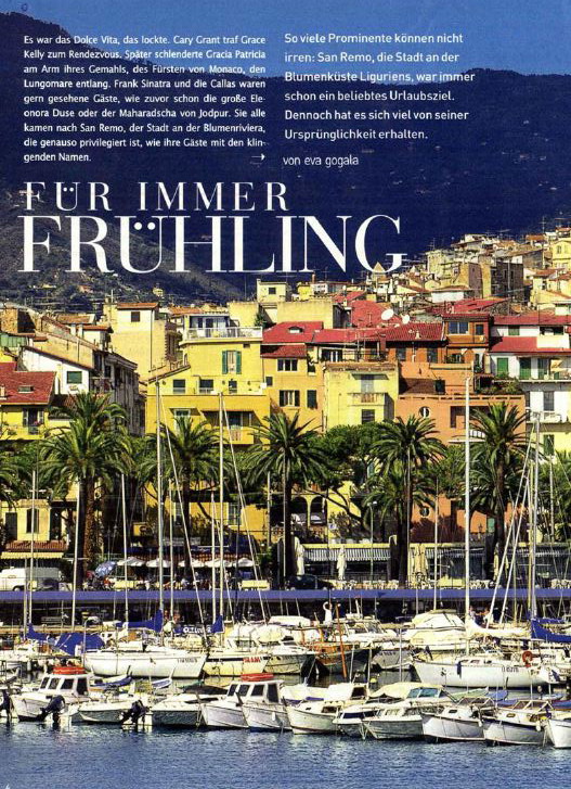 La presenza degli Amministratori comunali, ha fatto seguito alla trasferta del Sindaco nella capitale austriaca per rinsaldare i rapporti già esistenti in virtù della convenzione ultratrentennale con l’associazione viennese Blumenbüro Österreich ed il Comune di Sanremo. L’articolo sul settimanale, uscito il 7 gennaio, dal titolo 'Sempre primavera', offre un’ampia panoramica delle bellezze di Sanremo: i lussureggianti giardini e gli splendidi fiori, il dolce clima, gli eleganti edifici in stile liberty, tra cui il Casinò Municipale; Sanremo meta prediletta di personaggi dell’aristocrazia, del jet set, di divi della musica e dello spettacolo. Corredato da immagini che ben rendono i colori e l’atmosfera del nostro territorio, l’articolo, a firma di Eva Gogala, celebra anche Sanremo come sede di grandi eventi: dal Festival della Canzone Italiana alla sfilata di carri fioriti e alla Milano-Sanremo.