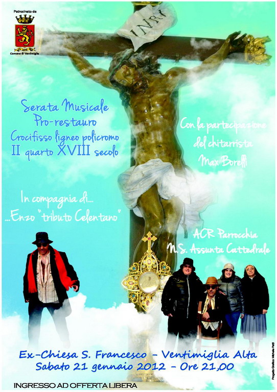 Sabato 21 gennaio alle ore 21 presso l'ex Chiesa San Francesco a Ventimiglia alta, si svolgerà la serata musicale destinata alla raccolta fondi pro restauro del Crocifisso ligneo policromo del II quarto del XVIII secolo, organizzato dal Convento delle Suore dell'Orto di Ventimiglia Alta, sotto la direzione di Suor Giuseppina, con il patrocinio del Comune di Ventimiglia.