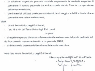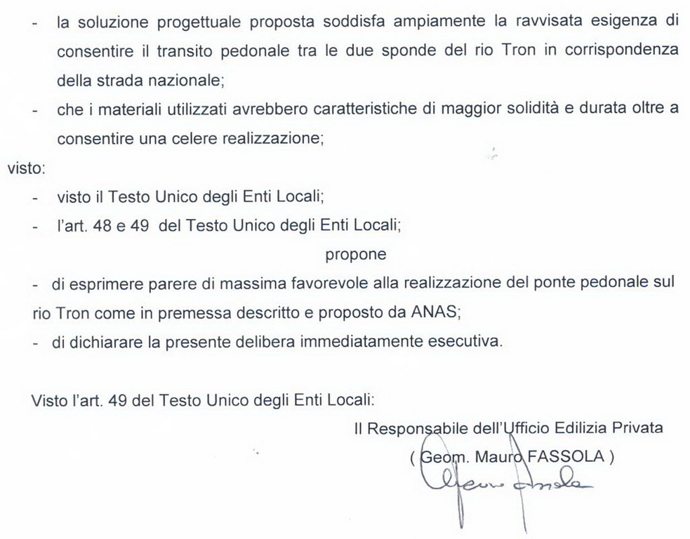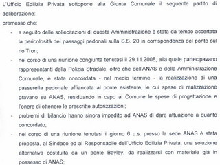 In questo modo l'Anas terrà fede agli impegni assunti nella riunione congiunta tenutasi il 29 novembre, nel corso della quale venne appunto concordata, quale rimedio a breve termine per la sicurezza, la realizzazione di una passerella pedonale con oneri di progettazione a carico del Comune e spese di costruzione a carico di ANAS.