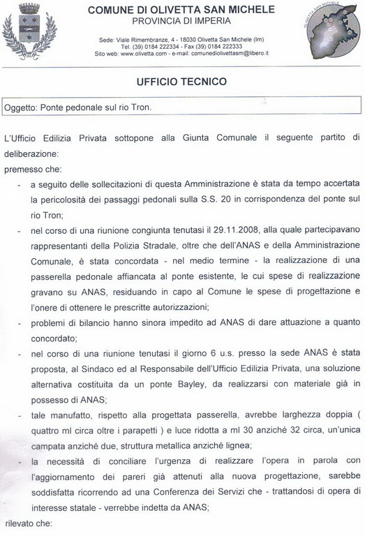 Verrà indetta a breve conferenza dei servizi per la costruzione di un ponte che consentirà ai pedoni di attraversare la frazione di San Michele in condizioni di sicurezza. Lo evidenzia il sindaco di Olivetta San Michele, Marco Mazzola: "Il ponte avrà una luce di 30 metri - continua il primo cittadino - e unirà le opposte sponde del rio Tron (affluente del fiume Roya), affiancandosi al ponte esistente, che verrà riservato solo al transito veicolare".