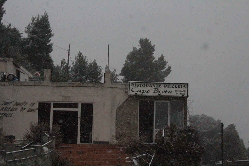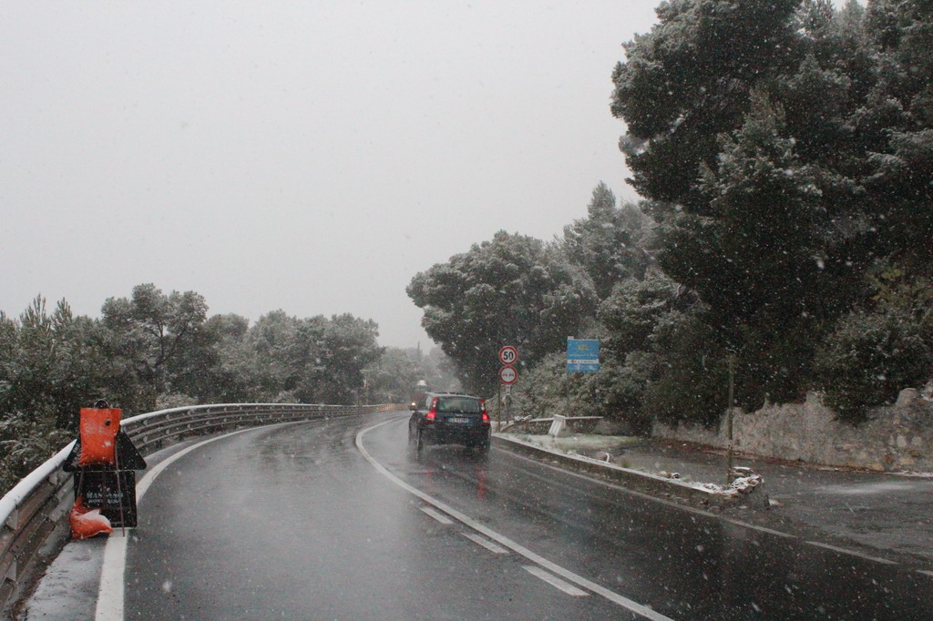 Abbondante nevicata anche ad Imperia, Diano Marina e nell'entroterra imperiese. La neve che sta scendendo da qualche ora abbondantemente non si è ferma al suolo anche se i tetti iniziano piano piano ad imbiancarsi. Siamo andati in cima a Capo Berta dove la neve invece si sta iniziando a posare.