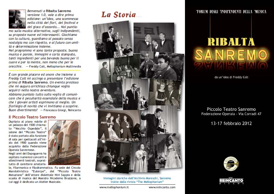 Ribalta Sanremo è un’iniziativa davvero indipendente e offre lo spaccato di un mondo culturale e creativo genuino che merita di essere conosciuto. Questa prima edizione è stata realizzata dall’etichetta sanremese Mellophonium Multimedia (espressione discografica del Centro Studi Musicali “Stan Kenton') in collaborazione con la 'gemella' bolognese Reincanto che a Sanremo festeggerà il suo primo compleanno. La realizzazione di un calendario di quasi trenta appuntamenti è reso possibile grazie allo sforzo di 'auto-produzione' e di auto-promozione di tutti gli artisti ed operatori coinvolti. In questo modo, forse, si può essere veramente indipendenti!