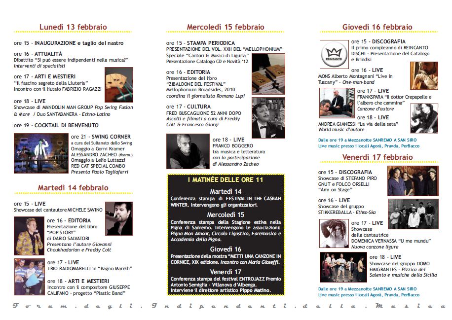 Gli Incontri del Mattino - Tutte le mattinate, da martedì 14 a venerdì 17, si terranno conferenze stampa per presentare iniziative musicali, festivals e rassegne, coinvolgendo esponenti della stampa specializzata: Rock in the Casbah edizione invernale, l’anticipazione del programma estivo della Pigna di Sanremo, la presentazione della mostra 'Metti una canzone in cornice' e infine la conferenza d’anteprima del nuovo festival Entro Jazz di Villanova d’Albenga con la partecipazione del noto jazzista Pippo Matino. Tutti gli incontri hanno inizio alle ore 11.