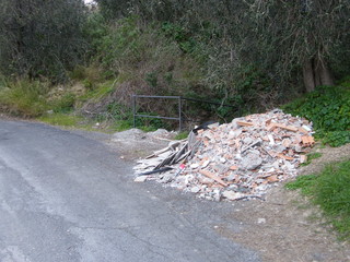 "Allego 2 fotografie scattate alcuni giorni fa tra l'abitato di Artallo (entroterra di Porto Maurizio) e la frazione di Massabovi. Si tratta di diversi metri cubi di materiale edile (mattoni, piastrelle, parti di sanitari, plastica, ecc.) scaricati in pieno giorno, da qualche imbecille anonimo, a bordo della strada definita 'panoramica'. Chi provvederà alla pulizia?"
