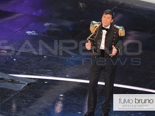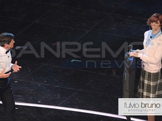 Un inizio ancora fuori dagli schemi tradizionali. Siamo all’esterno del teatro Ariston, Francesco Mandelli (de ‘I Soliti Idioti’) arriva su uno scooter per consegnare la giacca di scena a Morandi e si imbatte nel suo ‘compare Fabrizio’ Biggio nelle vesti di una svampita signorina addetta alla reception. La scenetta si snoda con la classica gag nonsense tra i due, nella quale uno domanda e l’altro risponde.