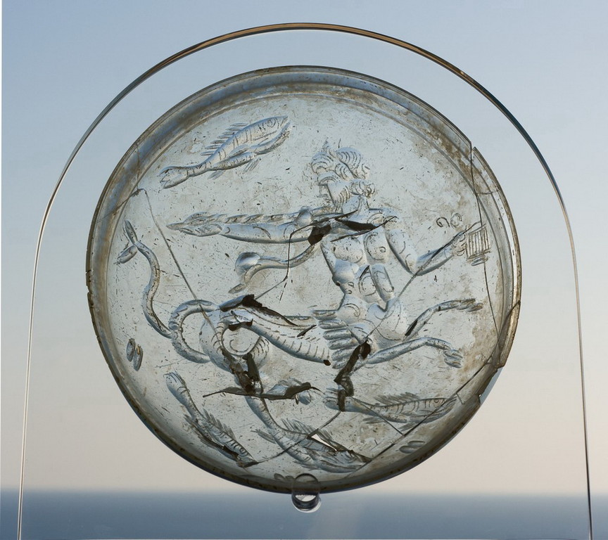 Martedì 14 febbraio, la coppa in vetro decorata con ictiocentauro, che fa parte delle collezioni esposte al Museo Civico Archeologico “Girolamo Rossi” di Ventimiglia, è stata trasferita presso il Museo della Curia Senatus di Roma, dove sarà visibile sino al 16 settembre prossimo nella mostra intitolata “I vetri a Roma”. L'esposizione è stata organizzata dalla Soprintendenza Speciale per i Beni Archeologici di Roma ed espone, nella suggestiva sede della Curia Iulia nel Foro romano, circa 300 pezzi tra vasellame prezioso, gioielli e mosaici, che raccontano il periodo di massimo fulgore della lavorazione del vetro nel mondo romano a partire dal II sec. a.C.