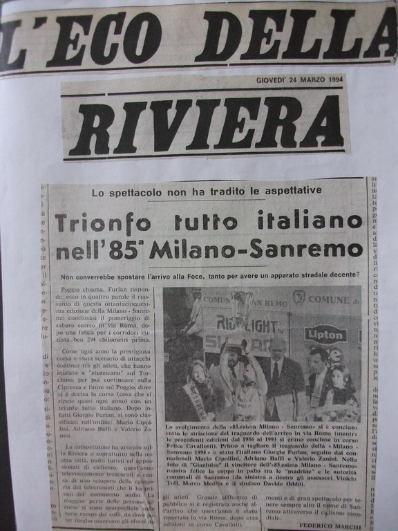 Lo scriveva quasi vent'anni fa, il 24 marzo 1994, un giovane cronista dal nome Federico Marchi (!!!) sullo storico Eco della Riviera. Passano gli anni ma evidentemente le cose non sono poi tanto cambiate. Anche quest'anno infatti, in occasione della corsa ciclistica Milano-Sanremo, il Comune della città dei fiori ha provveduto a far eseguire lavori di asfaltatura nelle strade cittadine toccate dalla ‘Classicissima’ di primavera.