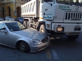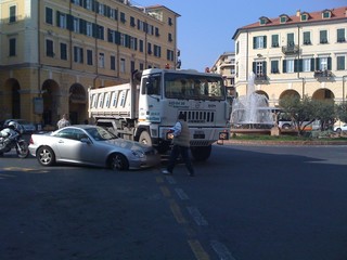 Incidente senza feriti in piazza Dante ad Imperia oggi pomeriggio intorno alle ore 16.30. Una Mercedes Slk 200, si è scontrata con un camion sembra per una mancata precedenza data da uno dei due conducenti.