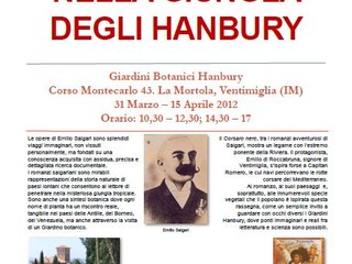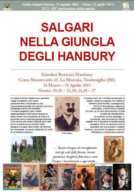 Domani, sabato 31 marzo, al piano terreno del palazzo dei Giardini Botanici Hanbury, si apre la mostra Salgari nella Giungla degli Hanbury, allestita in occasione del 150° anniversario della nascita dello scrittore Emilio Salgari.