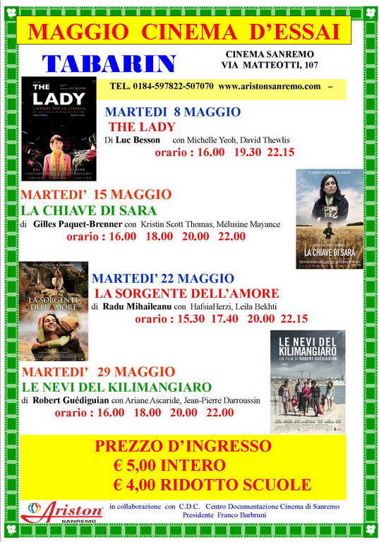 Intercettando il desiderio del pubblico più esigente ci sentiamo vincolati ad un impegno in questo senso. Fare in modo che la nostra città mantenga l’impegno di continuare a proiettare film d’essai durante la stagione cinematografica. Il Tabarin, piccolo gioiello, confortevole e che ultimamente si è dotato del digitale, , è la sala più adatta per la visione di film d’essai. Una perla incastonata in una collana di sale cinematografiche cittadine, che da l’idea della volontà di perseguire un traguardo: da una parte soddisfare gli spettatori più anziani, gli habituè insomma; dall’altra educare le nuove generazioni alla cultura cinematografica. Il Cinema non ti risolve i problemi, ma aiuta a vivere.