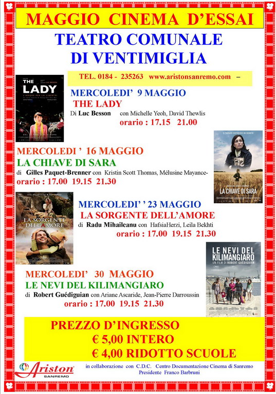 Poi l’eccellenza della Mostra Internazionale del Film D’Autore che scoprì giovani autori divenuti poi famosi. Per non contare la presenza delle nuove cinematografie di paesi lontani. In tutto questo panorama non vanno dimenticate le sale di cinema della nostra città: Sanremo ha una lunga tradizione. Benchè in piena crisi Sanremo mantiene salda la presenza dei suoi spettatori. Con l’impulso della partecipazione delle scuole locali, vedi David di Donatello; lo zoccolo duro degli spettatori anziani che, con calore si ostinano ad andare al cinema (che magica espressione), che li conforta in piacevoli scoperte nelle nuove opere; le nostre sale potranno guardare al futuro con un ragionevole ottimismo.