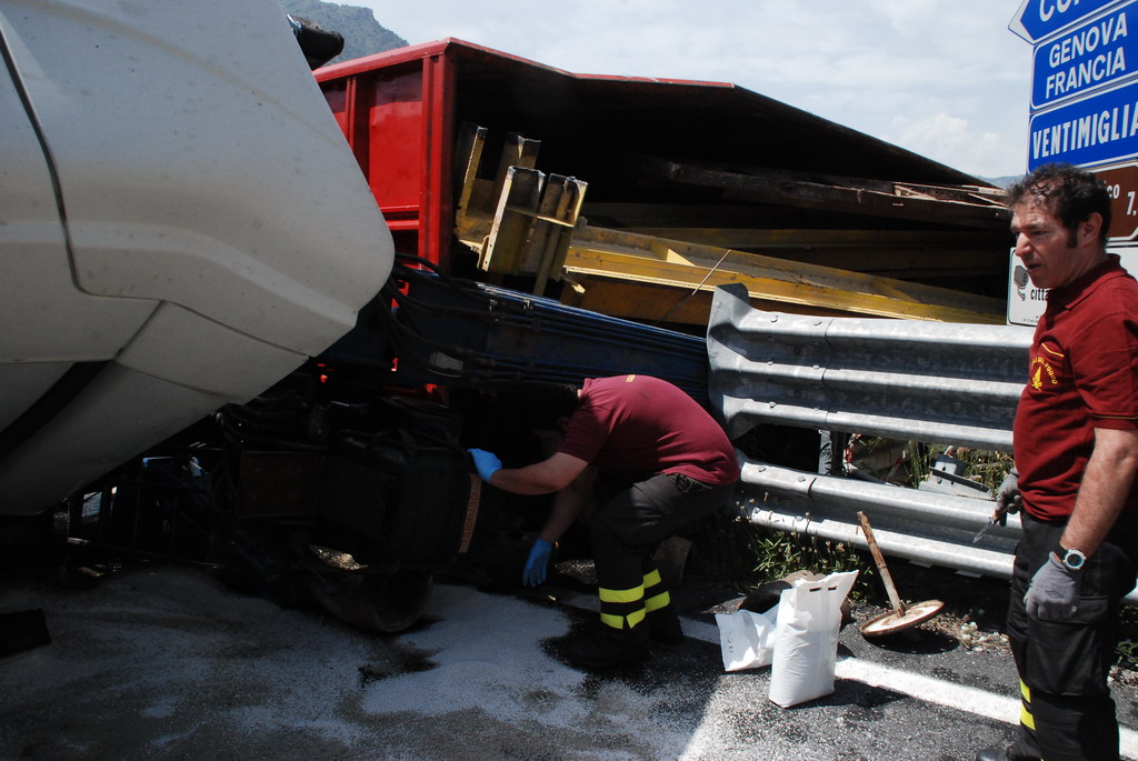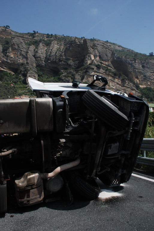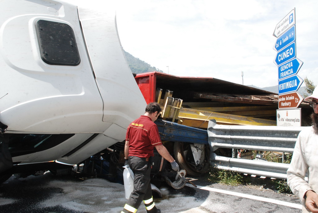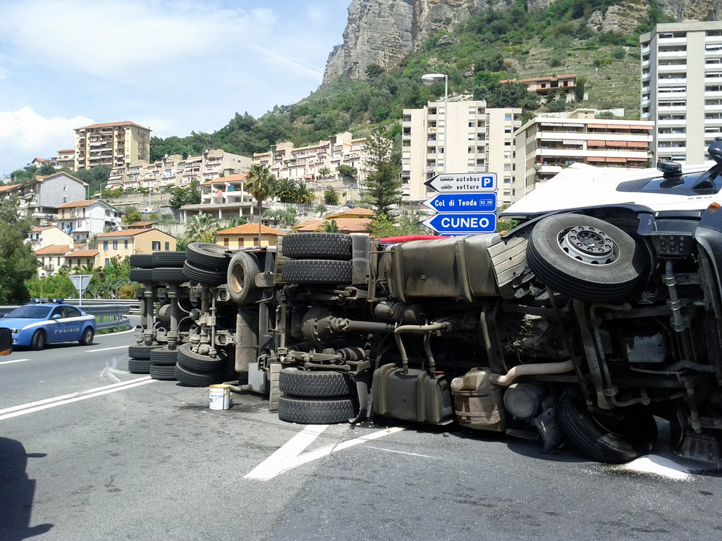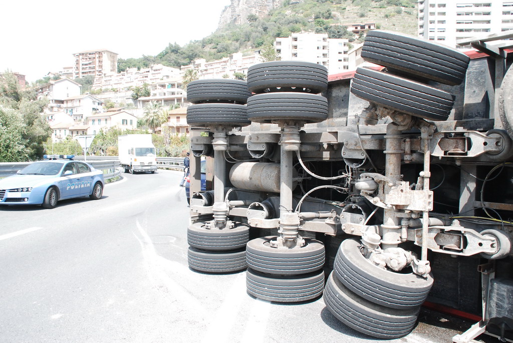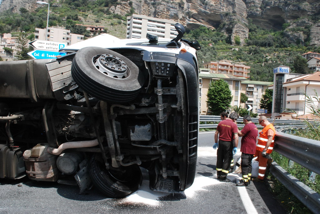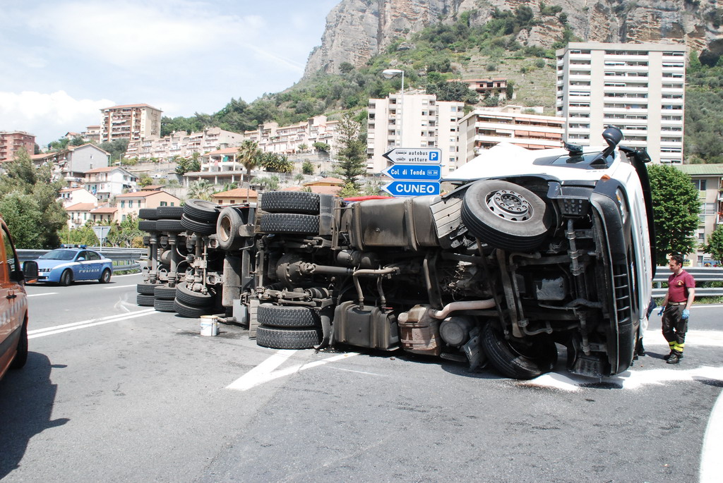 Ventimiglia: velocità troppo elevata in curva, camion si ribalta vicino a Roverino. Conducente illeso