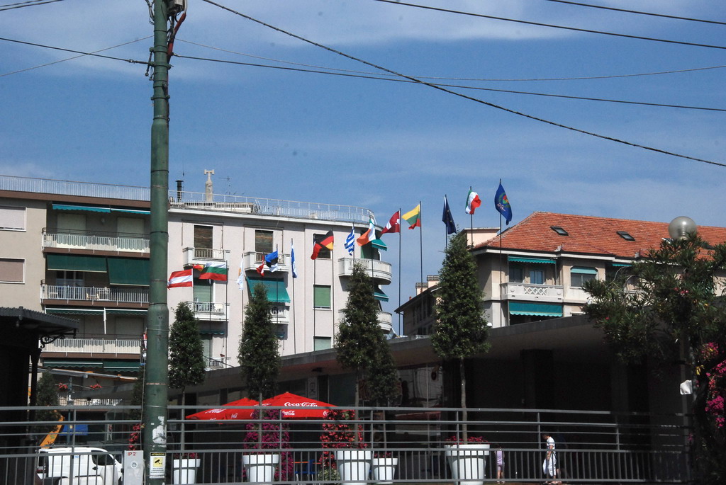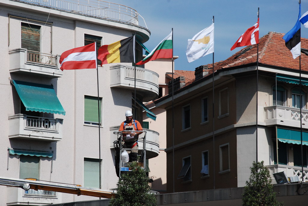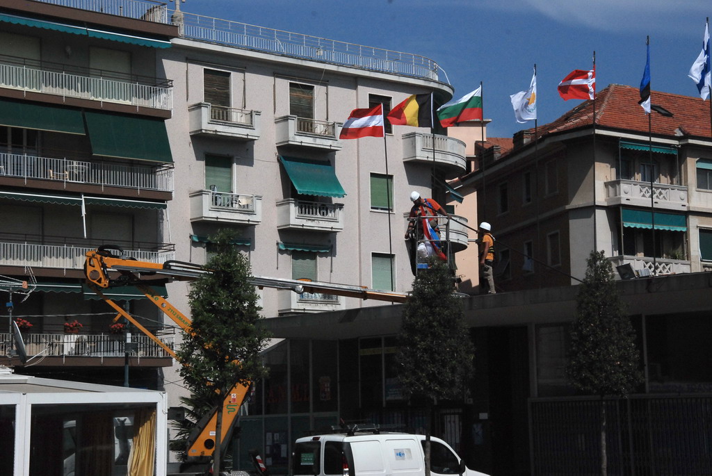 Le bandiere sono 29 e rappresentano tutti i paesi della Comunità Europea, oltre a quella di Sanremo e quella della blu con le stelle della Comunità stessa. Insieme a quella italiana sono posizionate al centro. Per ora i lavori sono terminati e riprenderanno solo con le opere di demolizione.