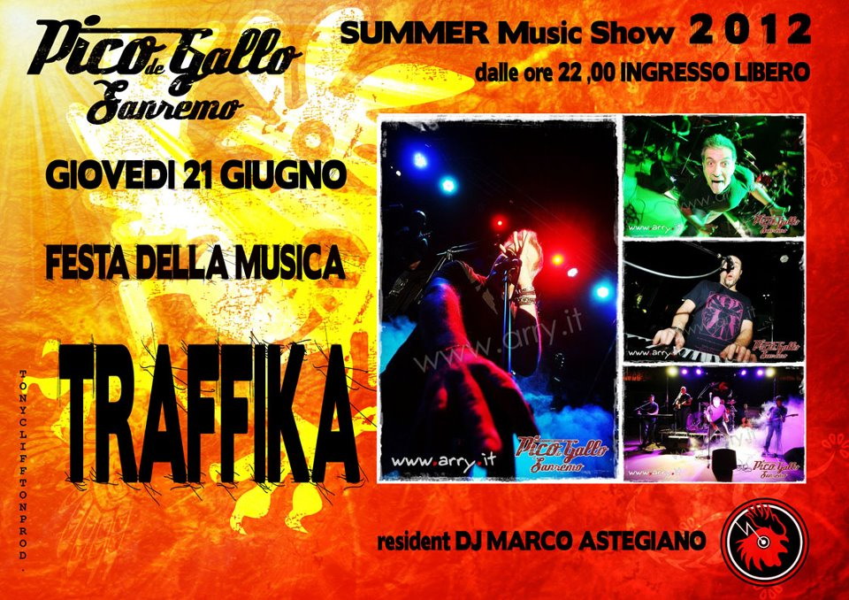 Questo giovedì , per salutare la Festa della Musica, on stage i Traffika, rock band proveniente da Brescia, titolare di alcuni album a proprio nome e con una vasta esperienza live in tutta Italia, gidati dal carismatico e potente cantante Ugo Frialdi. Sabato 23 sarà la volta dei Radioclash, tribute band ai Clash, assenti dai palchi sanremesi da due anni, ma molto attivi in tutta Italia. Nel lungo cartellone estivo del Pico de Gallo sono previsti, ogni sabato, tributi a Celentano, Ligabue, Vasco Rossi, Bruce Springsteen, Kiss, Rino Gaetano, Clash , Negramaro e altri ancora, con possibilità di cenare prima del concerto.