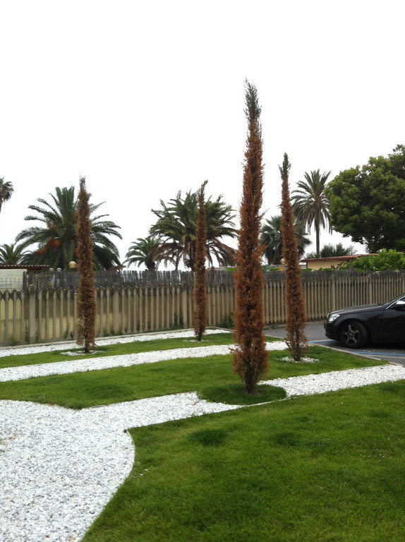 Dopo qualche mese (2-3) mi era capitato di ripassare davanti ai giardini in cui erano stati piantati i cipressi e la meraviglia fu grande nel vederli mezzi secchi, decisamente più morti che vivi. Nel giro di qualche altro mese la situazione era cambiata ulteriormente, i cipressi erano stati mozzati a metà, forse nel tentativo superfluo di farli riprendere (?).