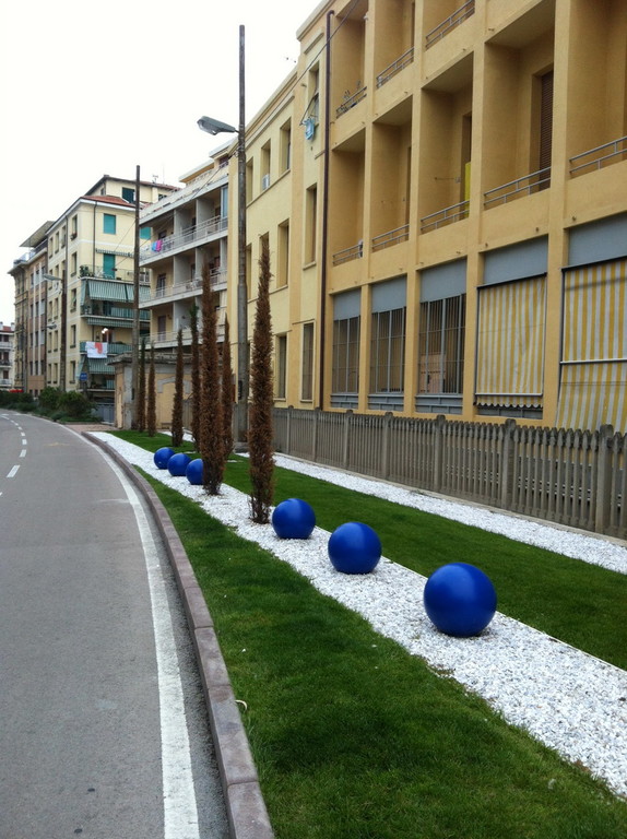 La 'triste' storia non finisce qui, purtroppo. Quest'anno, in onore della commemorazione del 25 Aprile, il giardino è stato rifatto, le palle blu sono state ricollocate ad opera d'arte e i cipressi morti sono stati sostituiti con una VENTINA di nuovi cipressi, belli verdi e prosperosi, come si ci aspetterebbe di vederli in un giardino comunale. Beh, l'esito del 'reimpianto' è sotto l'occhio di tutti. A meno che non abbiano già provveduto a rimuoverli, TUTTI i nuovi cipressi stanno seguendo le orme dei loro predecessori: stanno morendo!!