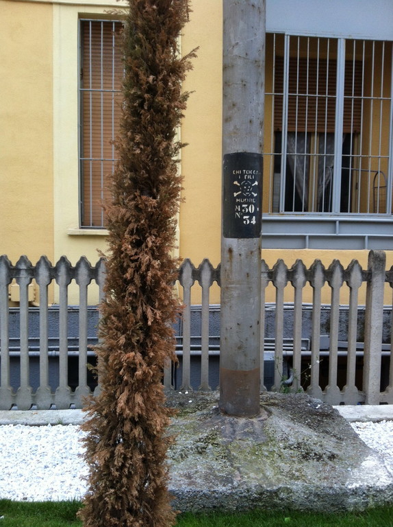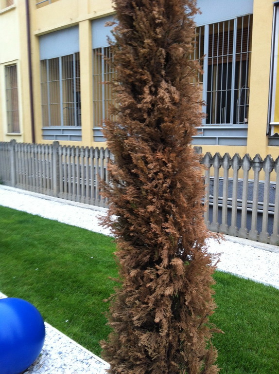 Ora, a prescindere dal fatto che una potatura del genere su un cipresso giovane è un azzardo, anche considerando la silhouette che questo genere di pianta dovrebbe avere, mi chiedo come possa il comune spendere dei soldi (io da privato li avevo pagati circa 200 € cadauno, quindi probabilmente il comune di più…) per delle piante che evidentemente non si prende nemmeno la cura di bagnare. Perché non posso pensare ad un'altra spiegazione, non stiamo parlando di una pianta con esigenze particolari, o sono state piantate nel cemento oppure nessuno le ha mai bagnate.