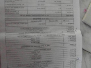 La triade prefettizia ha snocciolato i dati relativi ai gettiti provenienti dalle imposte sulle abitazioni. Il primo punto toccato sono le mancate entrate derivanti dalle voci “Minori trasferimenti statali” (-3.528.890, 32 euro) ed "Ex gettito Ici 2a casa" (4.993.986,54 euro), per un totale di -852.876,86 euro. Nel prospetto trasmesso (si veda sotto) i commissari hanno calcolato di ottenere 1.626.266,00 euro dal gettito Imu sulla prima casa e di 7.453.274,00 sulla seconda casa, per un totale 9 milioni e rotti euro, con una differenza rispetto al 2011 di oltre 550 mila euro. Da conteggiare però il “buco” causato dai debiti fuori bilancio, maturati negli anni passati, che sono di quasi 640 mila euro per le Causa Tarì (oltre 154 mila euro), debiti con la partecipata Aiga (circa 245 mila euro) e la causa Chiaro (oltre 240 mila euro).