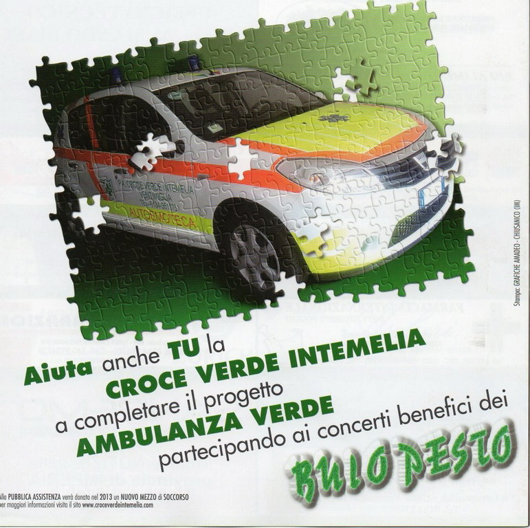 La Croce Verde é stata scelta dai Buio Pesto per il loro progetto 'Ambulanza verde', che consiste nel devolvere una parte del ricavato della vendita dei loro CD, degli incassi del concorso 'Esprimi un Desid€uro', che viene effettuato durante i concerti estivi e dagli incassi dei loro film benefici, all’acquisto di ambulanze o materiale tecnico-sanitario per le Pubbliche Assistenze più bisognose, da loro selezionate. Nel 2013 verrà donato alla Croce Verde Intemelia un mezzo di soccorso di cui avevamo fatto richiesta nel 2008.