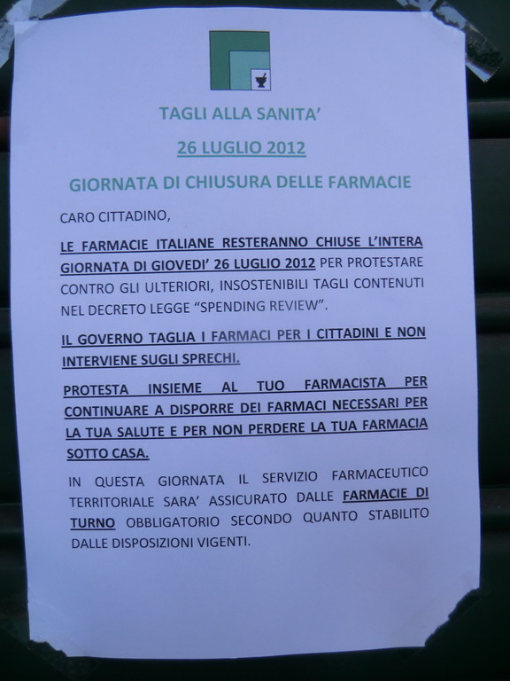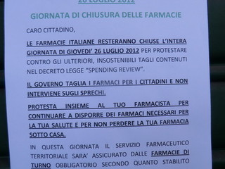 Dalla provincia di Imperia nessuno dei farmacisti si è recato a Genoa, dove 300 loro colleghi (compresi alcuni dipendenti) hanno manifestato contro la manovra ‘Spending review’ del governo Monti. Allo sciopero, indetto da Federfarma, ha aderito l'80% delle 297 farmacie private della provincia genovese. I farmacisti, che indossavano il camice bianco ed erano ‘armati’ di cartelli e striscioni (I testi: ‘Scioperiamo oggi per il futuro della tua salute’, ‘Spending review a pagare sei tu’, ‘Perchè distruggere la farmacia che funziona?’) hanno prima dato vita ad un corteo in piazza De Ferrari, di fronte alla Regione Liguria, quindi hanno percorso via Roma, fino ad arrivare alla prefettura. Lì una delegazione di rappresentanti della categoria ha incontrato il capo di gabinetto, dottor Gennaro Terrusi.