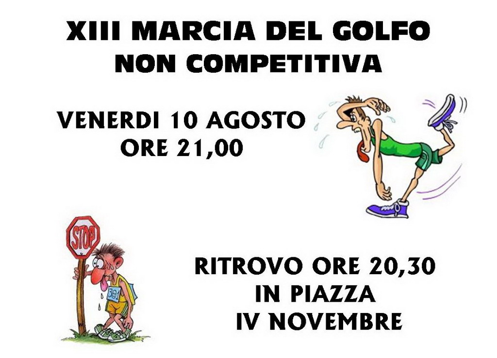 L’Associazione Sportiva Dilettantistica 'Sci Club Ospedaletti', in collaborazione dell'Asd Pro San Pietro e con il patrocinio del Comune di Ospedaletti organizza, per venerdì prossimo la 13a 'Marcia del Golfo', marcia non competitiva in notturna su un percorso cittadino di circa 9 km. Le iscrizioni possono essere effettuate presso l’Ufficio IAT del Comune di Ospedaletti in Via XX Settembre, 34 oppure direttamente alla partenza entro le 20.
