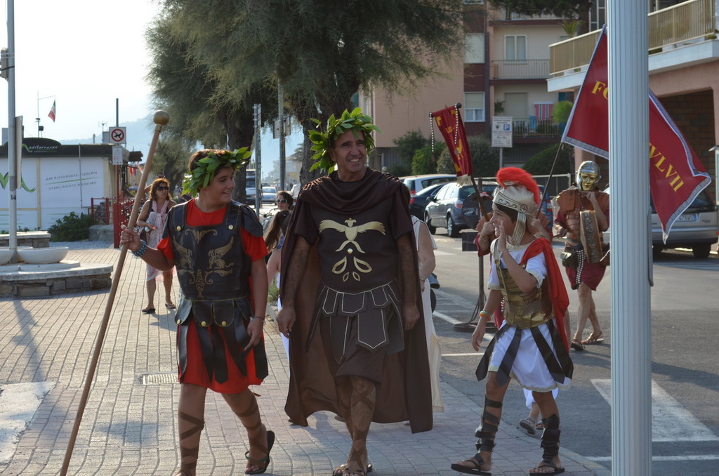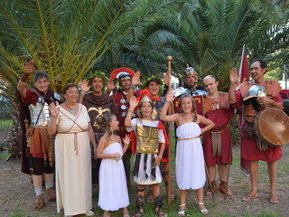 Una serata da sogno quella di venerdì scorso all’insegna dell’antica Roma che ha visto un pubblico che ha festeggiato con canti, balli e musiche al Ristorante da Erio nel suggestivo Giardino delle sette note. Festeggiamenti ultimati, a causa di una leggera pioggerellina, all’interno del ristorante dove il fasto e la squisitezza del buffet e della cena, accompagnati da ottimi vini, si sposò bene con l’abbigliamento in costume da legionari e dame dell’epoca. Ambientazione storico-culturale davvero di alta classe con descrizione degli elementi di abbigliamento di puro carattere bellico dei legionari: l’elmo corinzio, l’elmo attico, l’elmo imperiale, l’elmo a coppa, la corazza, il gladius (la spada), il pilum (giavellotto), il pugio (pugnale), lo scutum (scudo).