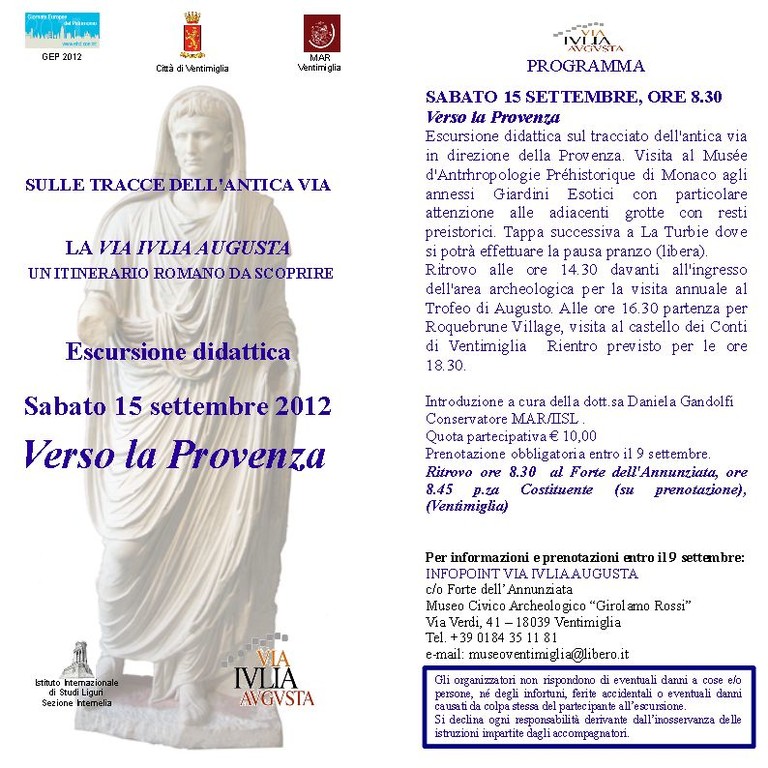 Il Punto Informativo Via Iulia Augusta e il Museo Civico Archeologico 'Girolamo Rossi', in collaborazione con la Città di Ventimiglia, organizzano sabato 15 settembre un'escursione didattica di una giornata che ripercorrerà l'antica via romana da Ventimiglia a La Turbie, alla scoperta delle tracce lasciate dall'uomo in questo territorio, prova di una frequentazione che si perde nella notte dei tempi.