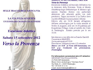 Il Punto Informativo Via Iulia Augusta e il Museo Civico Archeologico 'Girolamo Rossi', in collaborazione con la Città di Ventimiglia, organizzano sabato 15 settembre un'escursione didattica di una giornata che ripercorrerà l'antica via romana da Ventimiglia a La Turbie, alla scoperta delle tracce lasciate dall'uomo in questo territorio, prova di una frequentazione che si perde nella notte dei tempi.