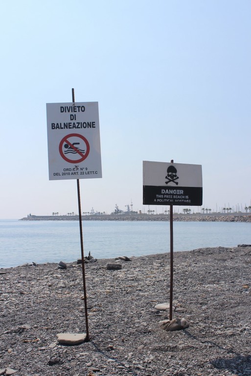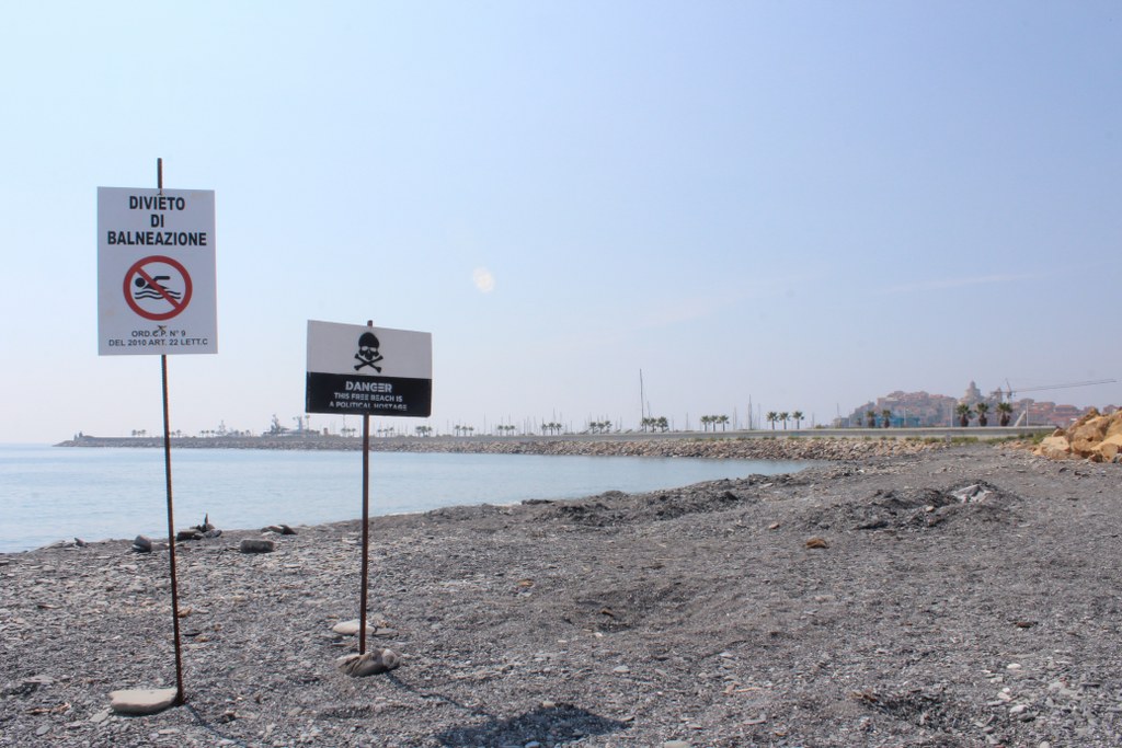 Imperia: posizionato un cartello/denuncia sulla spiaggia artificiale del parco urbano: "Spiaggia ostaggio della politica"
