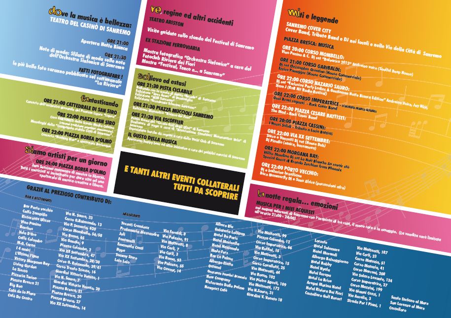 Il Casinò ospiterà la “Notte di moda”, con sfilate a cura di artigiani e commercianti, accompagnate dalle note dell’Orchestra Sinfonica di Sanremo. Musica e spettacoli a San Siro e in piazza Borea d’Olmo, esibizioni delle associazioni sportive sulla pista ciclabile in piazza Muccioli e via Escoffier e un ricco programma di aperitivi nei locali, happy hour con musica, dj-set e la musica dal vivo, con il filo conduttore che risponde al nome di “Sanremo CoverCity” (con il coordinamento di Angelo Giacobbe per la Cooperativa CMC di Sanremo). Non potrà mancare lo shopping con l’apertura in notturna di molti negozi e interessanti proposte per gli acquisti. Anche il Casino Municipale diventa punto nevralgico degli appuntamenti della Notte Bianca 2012 e lo fa ospitando un evento nell’evento: una sfilata di moda che prenderà vita sulle note dell’Orchestra Sinfonica di Sanremo. Il Teatro della Casa da Gioco diventerà, a partire dalle 21.30, una specialissima passerella per ammirare gli abiti di affermati atelier cittadini, accompagnati dalla musica dei Maestri dell’ensemble sinfonica. A sfilare per il pubblico splendide ragazze che indosseranno le creazioni di Bruno Tacchi Pellicce, Andrew's, Belles de Nuit, L’Inferno Boutique, Calida Store.