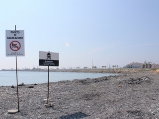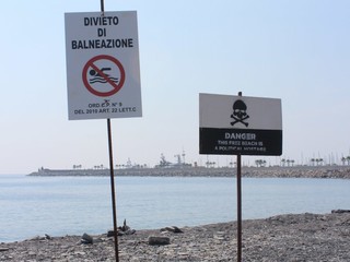 Imperia: posizionato un cartello/denuncia sulla spiaggia artificiale del parco urbano: "Spiaggia ostaggio della politica"