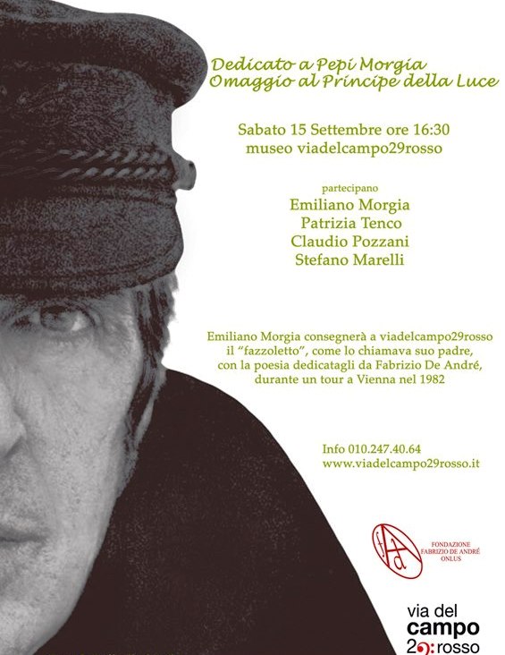 Sabato 15 settembre alle ore 16:30 a Genova presso l'emporio-museo viadelcampo29rosso Emiliano Morgia consegnerà a viadelcampo29rosso il “fazzoletto”, come lo chiamava Pepi, con la poesia scritta da Fabrizio De André, durante un tour a Vienna nel 1982.