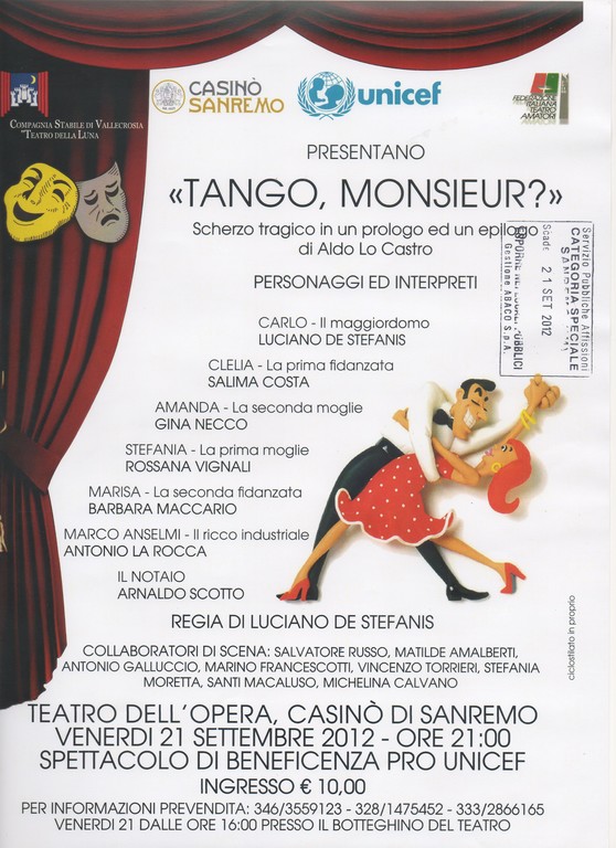 Venerdì, al Teatro dell’Opera del Casinò di Sanremo, nell’ambito della serata dedicata all’Unicef, la Compagnia della Luna porta in scena la commedia 'Tango Monsieur'. Vogliamo zero..', che intende abbattere la mortalità infantile dovuta a cause prevenibili. Personaggi ed interpreti: Luciano De Stefanis, Salima Costa, Gina Necco, Rossana Vignali, Barbara Maccario, Antonio La Rocca, Arnaldo Scotto, regia di Luciano De Stefanis.Collaboratori di scena: Salvatore Russo, Matilde Amalberti, Antonio Galluccio, Marino Francescotti, Vincenzo Torrier, Stefania Moretta, Santi Maccaluso, Michelina Calvano.Per informazioni e prenotazioni si può chiamare i numeri: 346 355 91 23; unicef 328 14 75 452; compagnia della luna 333 28 66 165; Il botteghino rimarrà aperto il venerdì dalle 16 fino alla fine del primo atto.