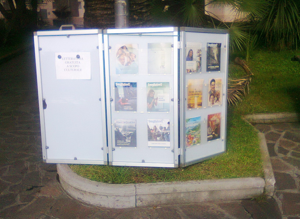 “Ormai oltre al consueto volantinaggio e sveglia della domenica mattina alle ore otto adesso i Testimoni di Geova 'occupano' i giardini pubblici con il materiale che le allego in foto. Oltre a non pagare per il volantinaggio penso che non paghino neppure il suolo pubblico”.